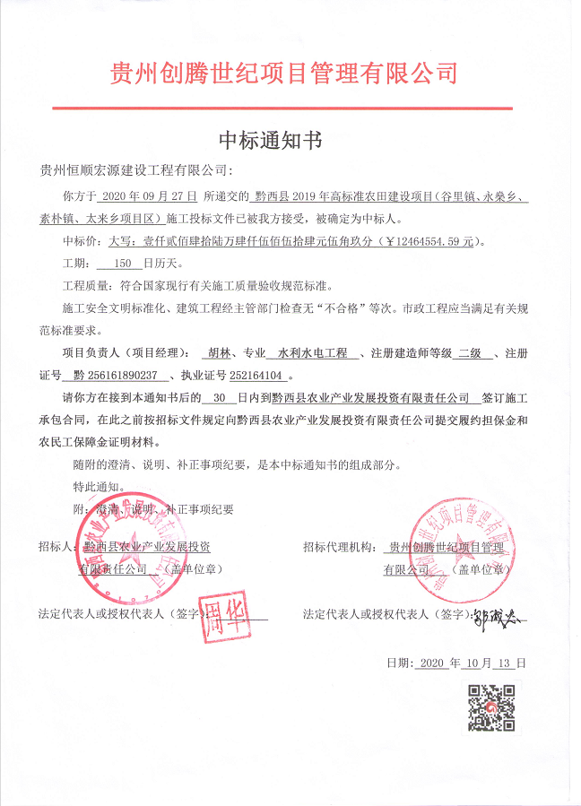 2020年9月27日,黔西縣農(nóng)業(yè)產(chǎn)業(yè)發(fā)展投資有限責(zé)任公司委托貴州創(chuàng)騰世紀(jì)項(xiàng)目管理有限公司代理的“黔西縣2019年高標(biāo)準(zhǔn)農(nóng)田建設(shè)項(xiàng)目(谷里鎮(zhèn)、永燊鄉(xiāng)、素樸鎮(zhèn)、太來(lái)鄉(xiāng)項(xiàng)目區(qū))”項(xiàng)目進(jìn)行公開(kāi)招標(biāo),經(jīng)評(píng)標(biāo)小組評(píng)審,采購(gòu)人確認(rèn),確定貴州恒順宏源建設(shè)工程有限公司為中標(biāo)人。